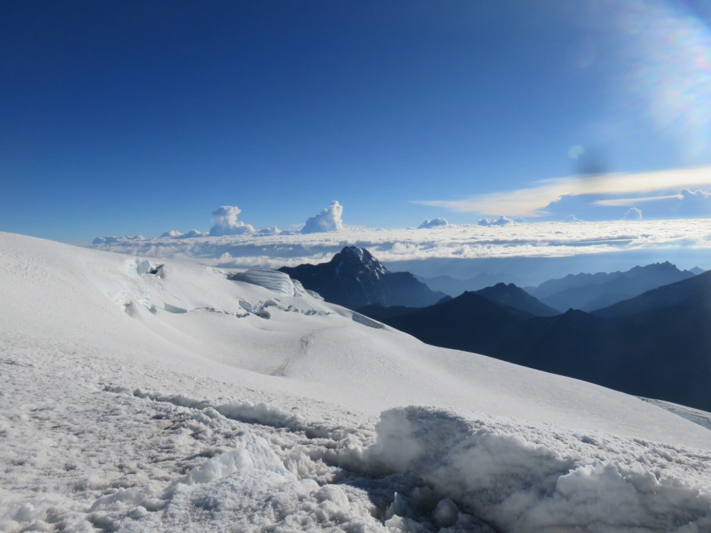 The first really tough bit was at the halfway mark (around 2.5 hours in) where we had to use the ice axe to pull ourselves up a steep, narrow, icy corridor. I had my first sitting down (collapsed in a heap) break after that exertion – I was goosed and my axe arm was completely dead. But after a bit of water and chocolate, which Victor forced on me even though I had no desire for either, we were up and moving forward again up a steady incline for about another hour. After this relatively easy-ish section we were 200m and about two hours away from the top. I was starting to feel a bit nauseous and all the breaks we were taking with the other pairs were making it worse. I started encouraging Victor to keep moving so I’d be distracted from the growing urge to either spew or something much worse in the middle of the ice field we were now in. He kept shining his lamp in my face to check I wasn’t going funny and we kept pushing forward. Those last two hours were hell. The terrain was difficult to negotiate, I was feeling sicker and sicker as we went on and every step was heavier than the last. I was telling myself that ironman had been harder than this but I’m not even sure that’s true! There was another icy corridor that required the ice axe near the top which very nearly broke me. Never the less, we made it up before the other groups in about 5.5 hours and before the sunrise which we got to watch from the summit. When the sun came up the view was outrageous and after taking a lot of photos I suggested we start making our way down. I was not feeling good at all. I couldn’t even enjoy my summit celebration chocolate because my stomach was still in bits and it was also quite cold up there.