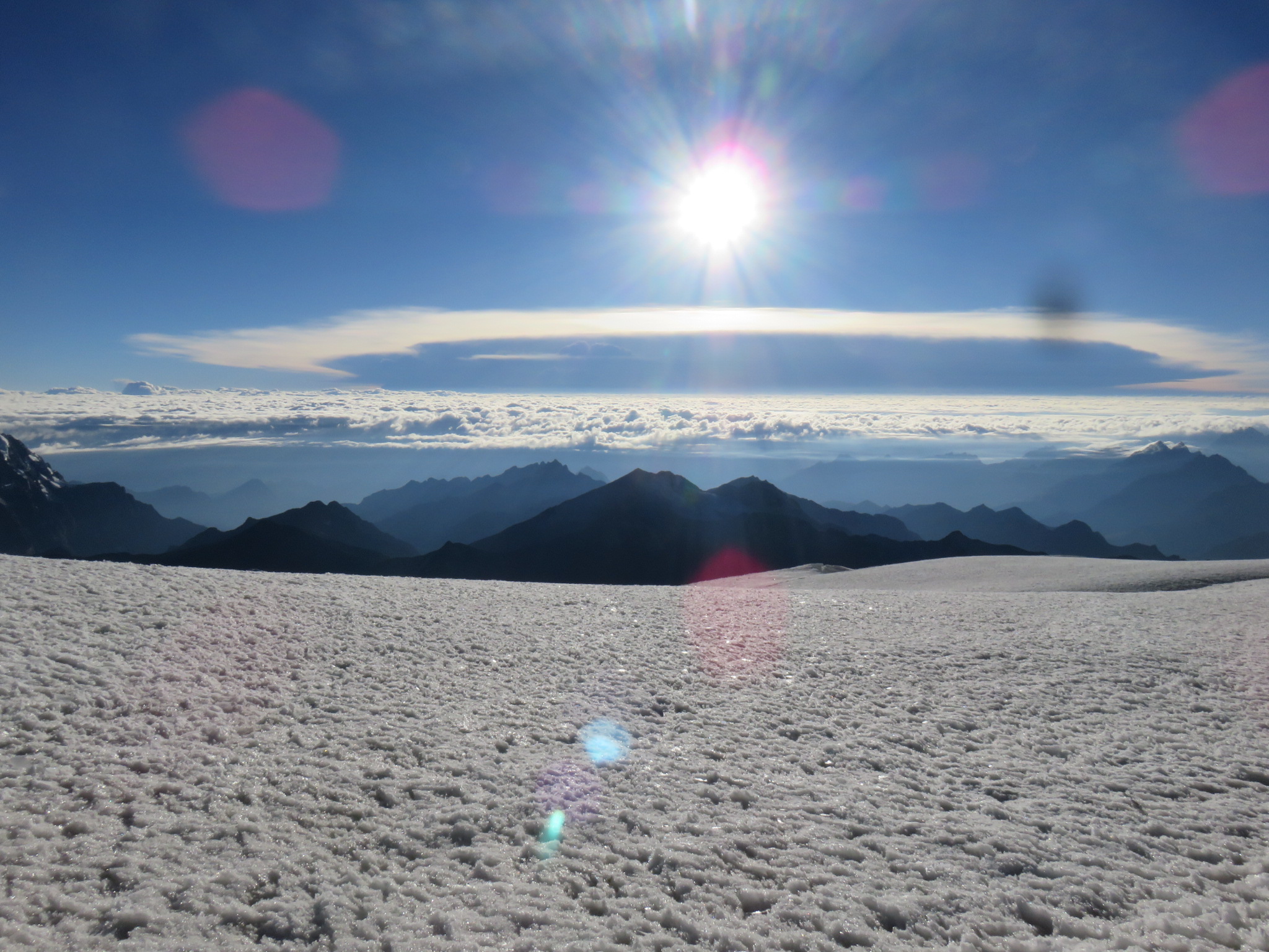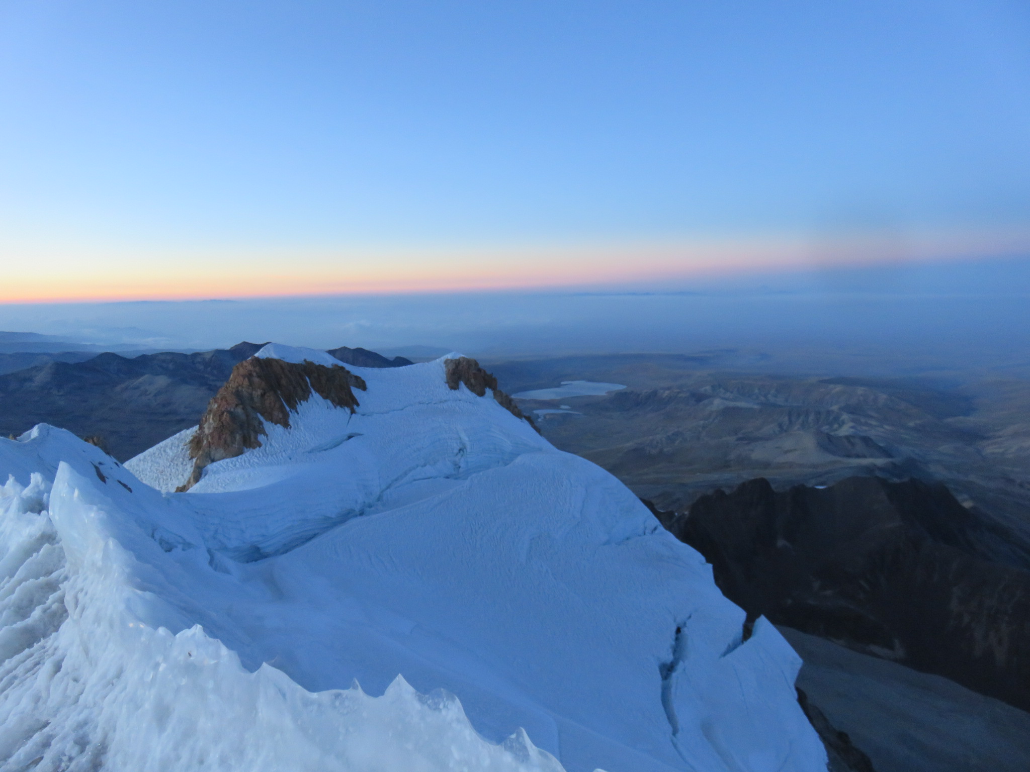 The first really tough bit was at the halfway mark (around 2.5 hours in) where we had to use the ice axe to pull ourselves up a steep, narrow, icy corridor. I had my first sitting down (collapsed in a heap) break after that exertion – I was goosed and my axe arm was completely dead. But after a bit of water and chocolate, which Victor forced on me even though I had no desire for either, we were up and moving forward again up a steady incline for about another hour. After this relatively easy-ish section we were 200m and about two hours away from the top. I was starting to feel a bit nauseous and all the breaks we were taking with the other pairs were making it worse. I started encouraging Victor to keep moving so I’d be distracted from the growing urge to either spew or something much worse in the middle of the ice field we were now in. He kept shining his lamp in my face to check I wasn’t going funny and we kept pushing forward. Those last two hours were hell. The terrain was difficult to negotiate, I was feeling sicker and sicker as we went on and every step was heavier than the last. I was telling myself that ironman had been harder than this but I’m not even sure that’s true! There was another icy corridor that required the ice axe near the top which very nearly broke me. Never the less, we made it up before the other groups in about 5.5 hours and before the sunrise which we got to watch from the summit. When the sun came up the view was outrageous and after taking a lot of photos I suggested we start making our way down. I was not feeling good at all. I couldn’t even enjoy my summit celebration chocolate because my stomach was still in bits and it was also quite cold up there.