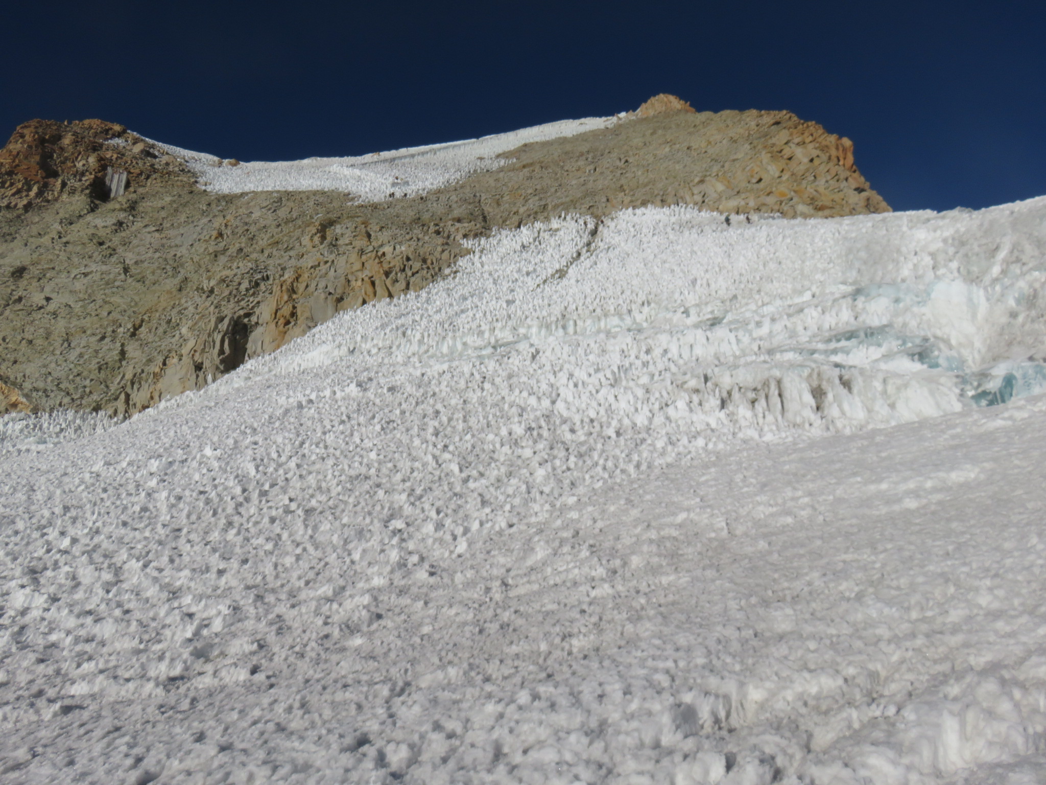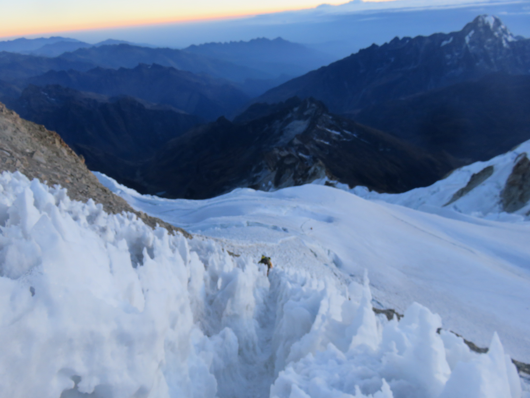 We were all in bed by 7pm in anticipation for our 11.30pm wake up call – some of us got two hours sleep at the most with some not sleeping at all. Between people getting up to go to the outdoor toilet, everyone breathing very heavily due to the thin air and lots of tossing and turning attributed to altitude sickness and nerves about the impending hike it was quite a noisy dorm. But we were all up, fed and dressed to start the hike at 12.30am as planned in five pairs with a guide for each duo – everyone topped with a headlamp as it was the middle of the night. I was paired with a Brazilian guy who decided very quickly that he wouldn’t make the top and headed back for the lodge with our guide Victor. I temporarily joined another pair and after the initial hour of rock scrambling we attached our crampons and grabbed our ice axes to start hiking on the glacier. The three of us were attached to one guide for about an hour before Victor came charging up the hill beside us.