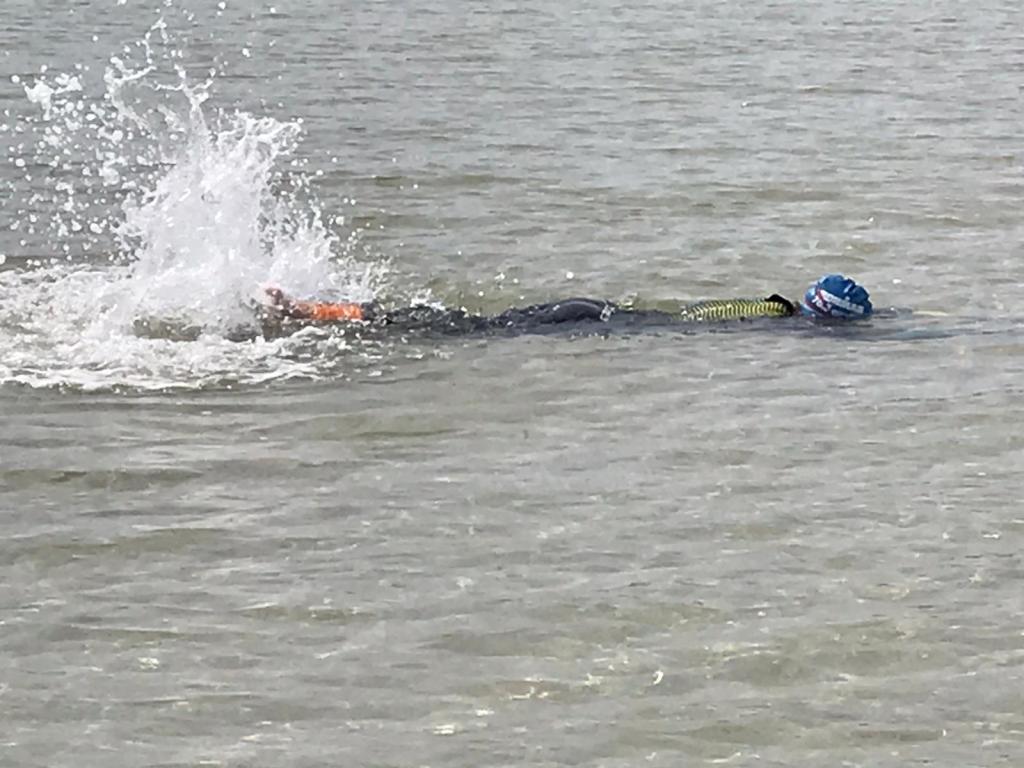 We hit the strand bang on target but this high tide was not the same high tide that I remembered. It was about a foot high at the highest point. I tried to float and crawl along but at some point I did beach myself and decide to run the 200m – is that cheating?!